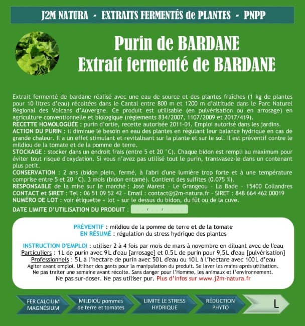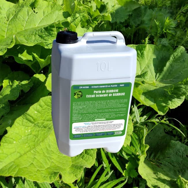 Purin de bardane réalisé avec une eau de source de montagne et des feuilles de bardane (1 kg de feuilles de bardane pour 10 litres d’eau) récoltées à la main dans le Cantal entre 800 m et 1300 m d’altitude dans le Parc Naturel Régional des Volcans d’Auvergne. Ce produit naturel est à diluer avec de l'eau lors de son utilisation.