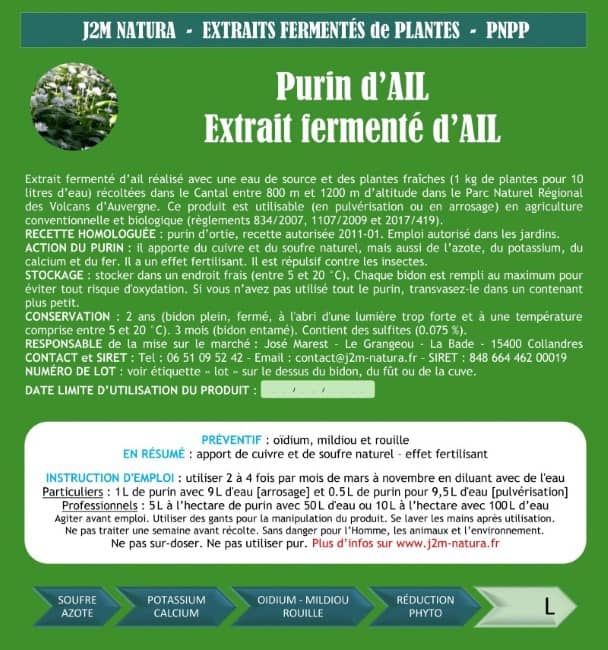 Efficacité, utilité et propriétés Le purin d'ail apporte du soufre et du cuivre naturels, directement assimilables par la plante et la protège en augmentant ses facultés d'auto-défense. Il est...