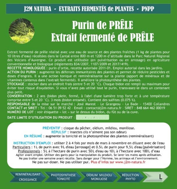 Efficacité, utilité et propriétés Le purin de prêle favorise la photosynthèse et la tonicité des plantes et les aide à se développer. C'est aussi un bon répulsif pour les insectes (son odeur est...