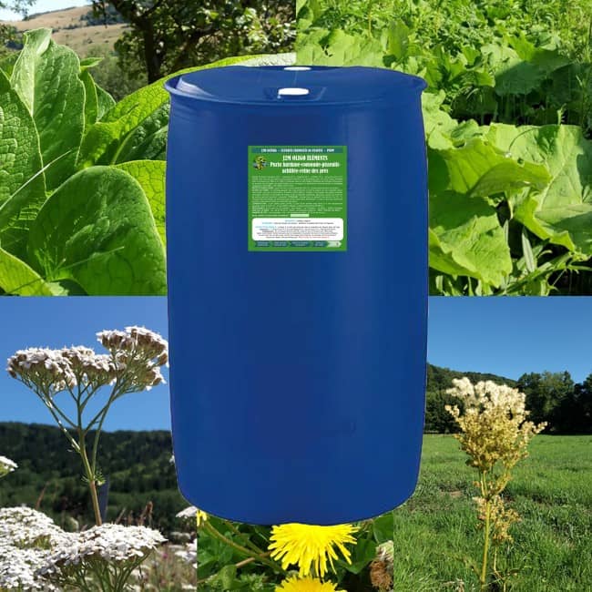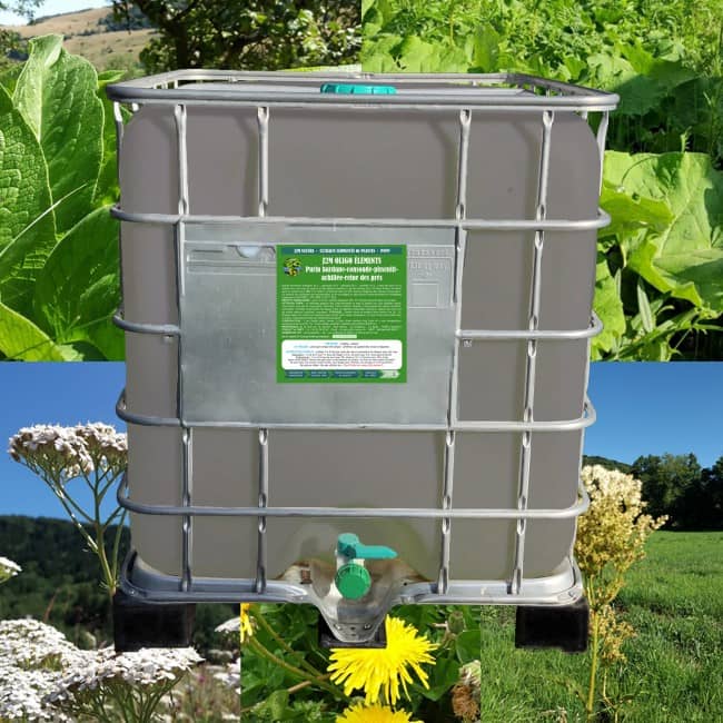 Mélange d'extraits fermentés adapté aux climats chauds Purin de bardane (30 %) - Purin de consoude (25 %) - Purin de pissenlit (25 %) - Purin d'achillée millefeuille (10 %) - Purin de reine des...