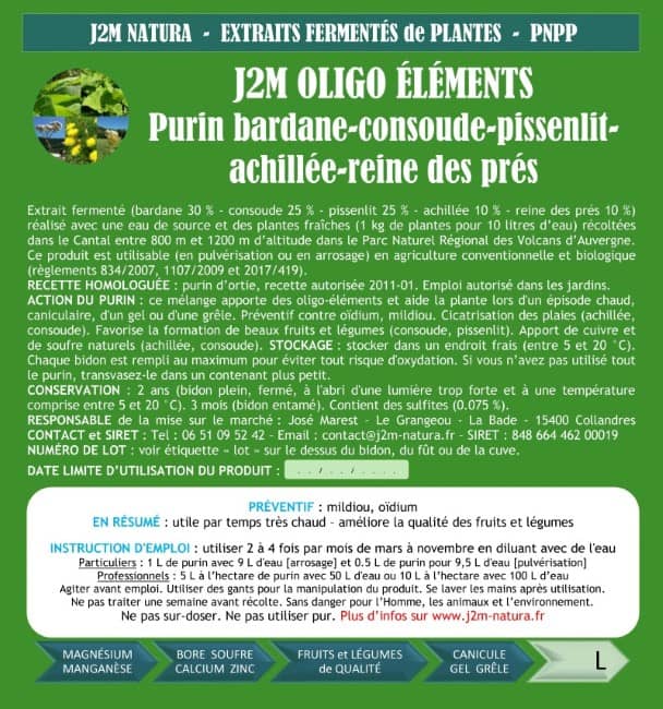 Un mélange complet et équilibré pour toutes les cultures Purin d'ortie (25 %) - Purin de consoude (25 %) - Purin de prêle (25 %) - Purin de fougère (25 %) Il est préventif contre les maladies et...